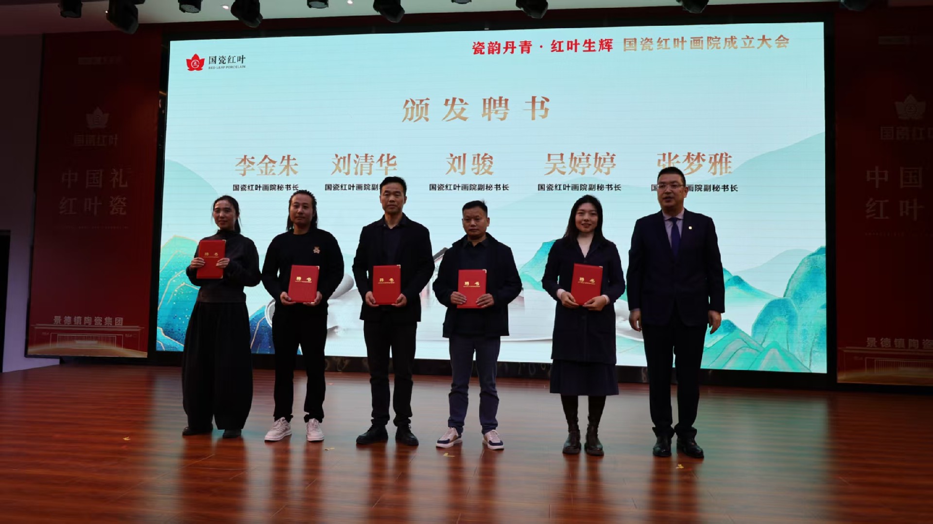 瓷都盛會(huì)話傳承,紅葉溢彩繪新篇。11月9日上午,景德鎮(zhèn)陶瓷集團(tuán)旗下國(guó)瓷紅葉畫院成立大會(huì)在紅葉陶瓷國(guó)瓷館隆重舉行。江西省輕工業(yè)聯(lián)合會(huì)理事長(zhǎng)鄭正春,景德鎮(zhèn)市政府黨組成員、昌南新區(qū)黨工委書(shū)記余立新,景德鎮(zhèn)陶瓷研究院黨組書(shū)記、院長(zhǎng)吳浪,江西陶瓷工藝美院黨委委員、副院長(zhǎng)朱輝球,江西省輕工業(yè)聯(lián)合會(huì)秘書(shū)長(zhǎng)崔軍,景德鎮(zhèn)陶瓷協(xié)會(huì)秘書(shū)長(zhǎng)陳華清,中國(guó)工藝美術(shù)大師劉偉,中國(guó)工藝美術(shù)大師黃景藏,景德鎮(zhèn)陶瓷大學(xué)設(shè)計(jì)藝術(shù)學(xué)院院長(zhǎng)余劍峰,景德鎮(zhèn)學(xué)院陶瓷美術(shù)與設(shè)計(jì)藝術(shù)學(xué)院黨委書(shū)記陳后輝,市工信局副局長(zhǎng)朱成,市昌南新區(qū)黨工委委員、管委會(huì)副主任張英,景德鎮(zhèn)新聞傳媒集團(tuán)副總經(jīng)理丁添,北京天壇文化產(chǎn)業(yè)有限公司CEO王莎莎,嗶哩嗶哩Vsinger業(yè)務(wù)部—市場(chǎng)總監(jiān)劉冰潔及景德鎮(zhèn)陶瓷集團(tuán)領(lǐng)導(dǎo)班子等領(lǐng)導(dǎo)和嘉賓出席大會(huì)。